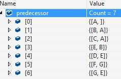 So when we start from 6th item(where index is 5 {[F,G]}), the value in the dictionary is "G". Next, we look for an item where "G" is the key in the predecessor. We find that the 7th item ({[G,E]}) has "G" as the key. Then iterate until we reach the source node, "A". Since we are traversing backward, it seems like a stack would do the job to return the result in LIFO order.