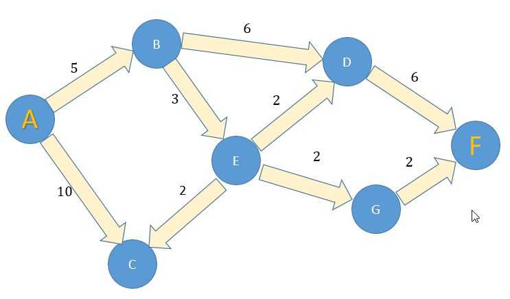 The shortest path between "A" and "F" is "A->B->E->G->F".