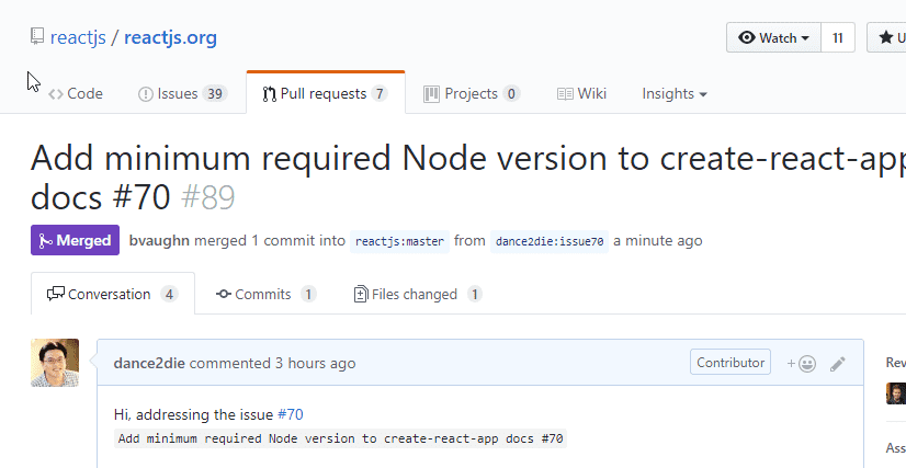 After generating a PR, you will see a PR on ReactJS.org Pull requests tab.