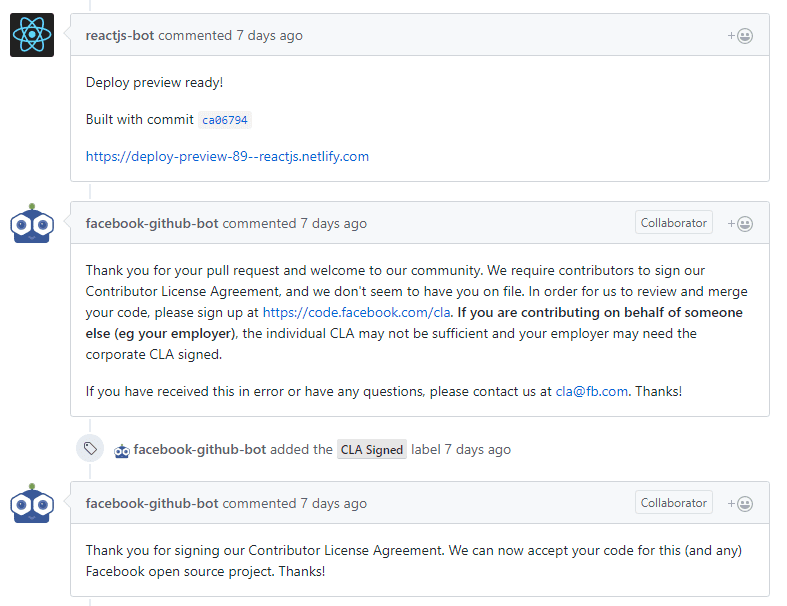 Not long after your PR is created, a Facebook bot will ask you to sign a Contributor License Agreement.