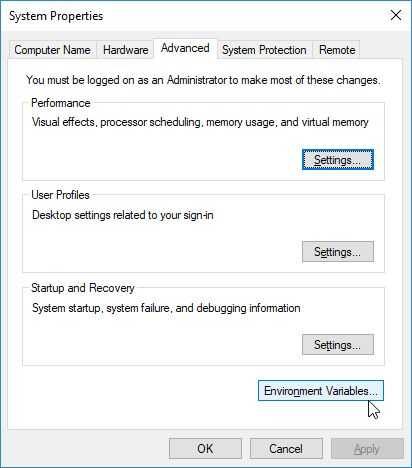 On "System Properties" dialog, click on "Environment Variables..." button.