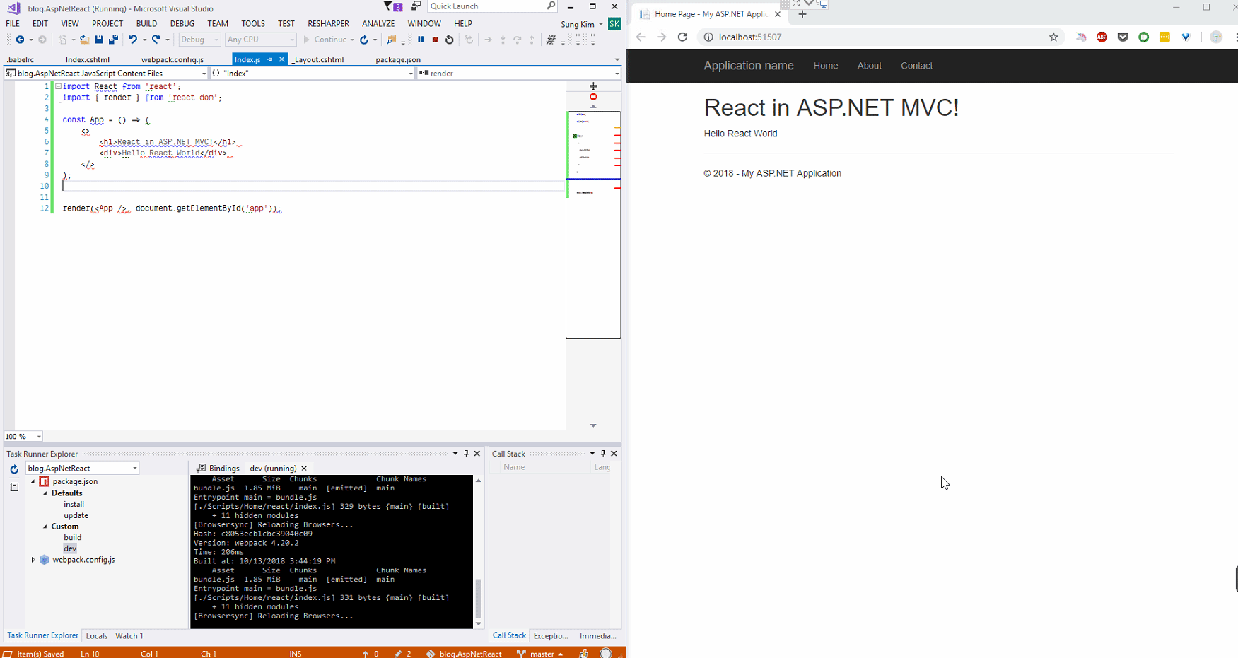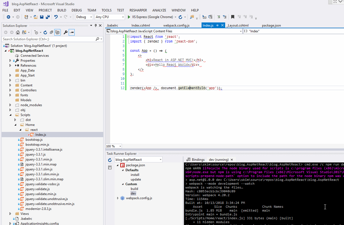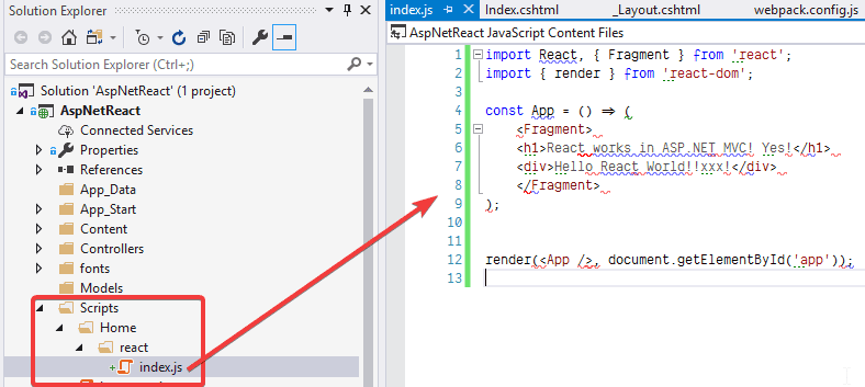 Now we have an entry point, let's write a simple React file index.js under Scripts\Home\react directory.