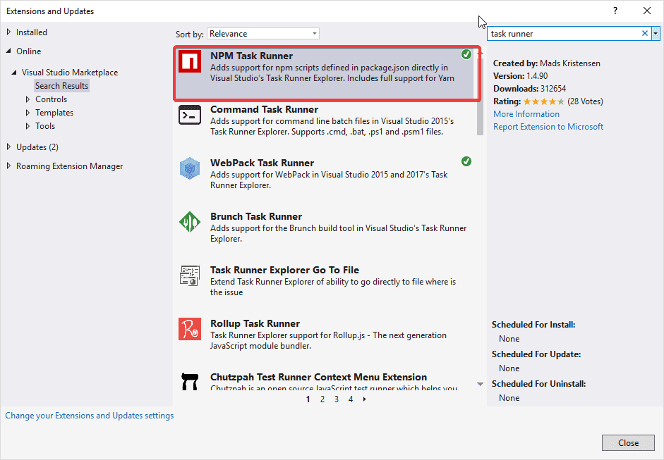 This is an optional step but to make our lives easier, let's install a Visual Studio extension, NPM Task Runner for running NPM scripts from Visual Studio.
