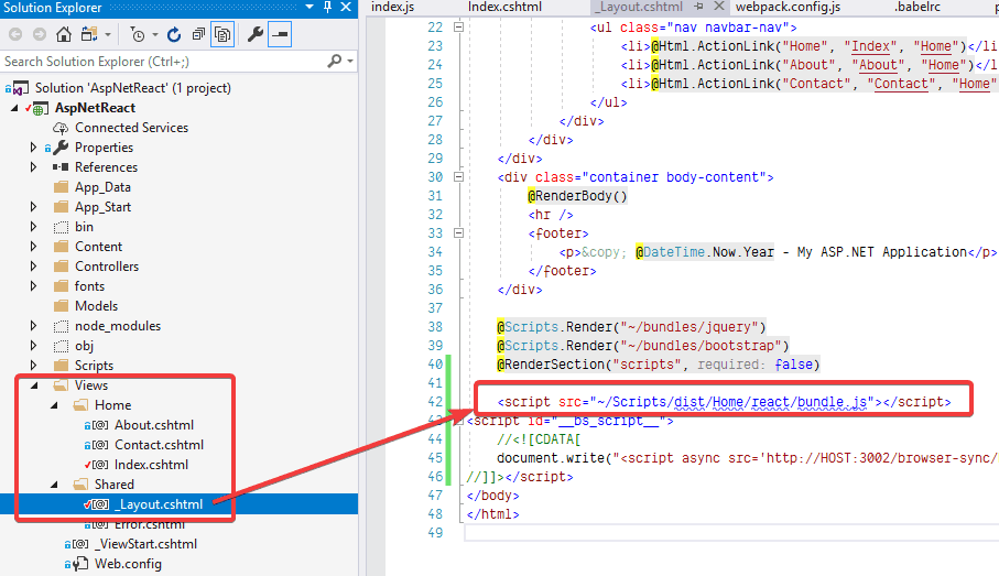 Webpack outputs a bundle as ./Scripts/dist/Home/react/bundle.js so let's add the script in View\Home\Index.cshtml razor file.