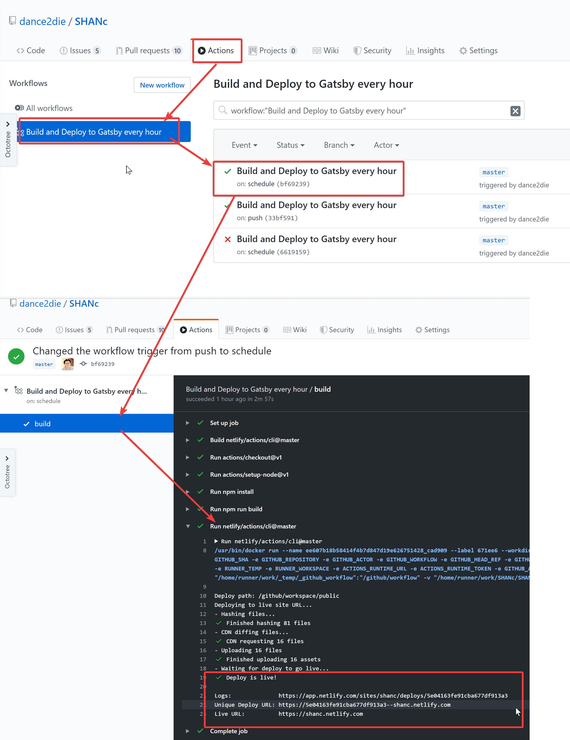 After commiting the workflow file, you can see that the Gatsby was built and deployed to Netlify successfully in the log.