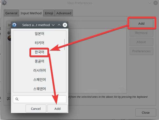 - Find and select Korean (한국어) and click on "Add" button, and close the preferences dialog