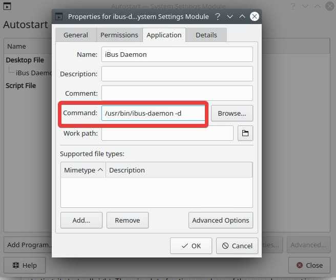 - Click "OK" to close "Choose Application" dialog, which then opens "Properties for ibus-daemon-desktop" dialog, automatically