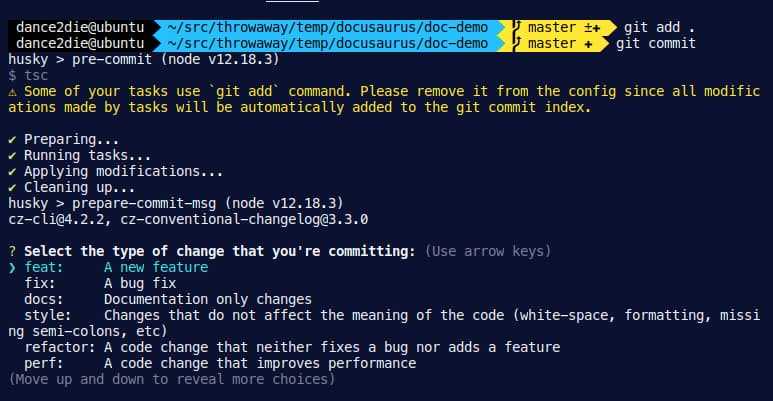 }When you stage your files and type git commit, you should see commitzen-conventional-log prompt.